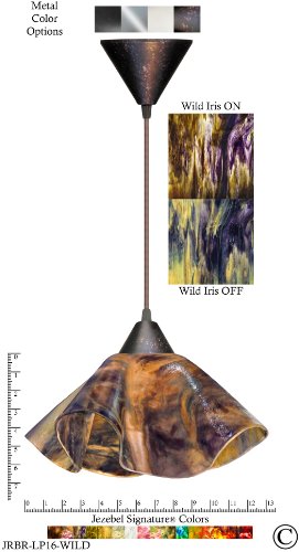 FeaturesHandmade in the USAThis glass is made by a special process patented to Jezebel®The dimensions of the glass shade are 6.5"H x 11"W x 11"D.Comes with 8.5 feet of adjustable cordThe dimensions of the Brown Metal are: Cap for the Ceiling: 4" high, 4 7/8" diameter. Cap for the Glass: 2 1/2" high, 3" diameter. Jezebel Signature® Lily Pendant Large. Hardware: Brown. Glass: Wild Iris?
