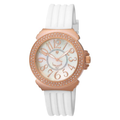 #A striking blend of luxe details and a down-to-earth white rubber strap, the Lancaster Women's Pillola Mother of Pearl Dial Watch defies easy categorization. It has a distinctive style that is both modern and classic, and instantly impresses with its sparkling, crystal-adorned rose-gold-tone stainless steel case. A crisp white dial showcases rose-gold-tone Arabic numerals, luminous hands, and an inside minute track. A scratch-resistant crystal guards against wear and tear, while quartz movement ensures optimum precision. This Lancaster original arrives in a slim black gift box and is water resistant to 165 feet (50 meters).